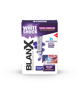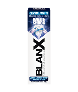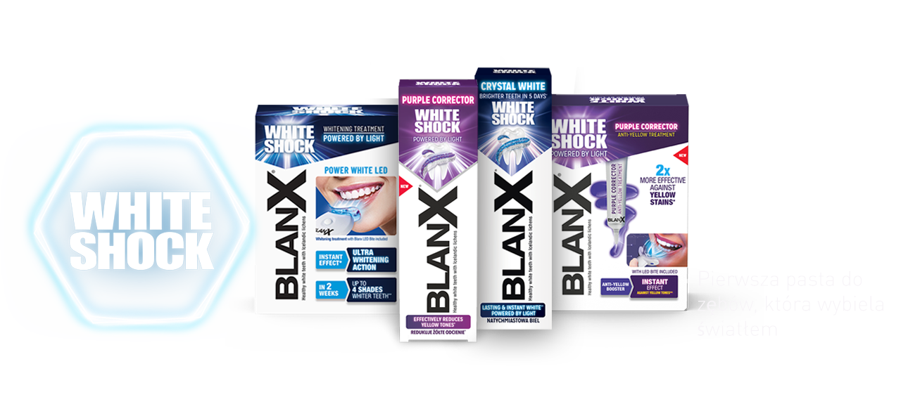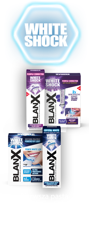 BlanX® White Shock to pierwsza gama produktów, która wybiela zęby w sposób naturalny bez nadtlenku. Formuła działa przez światło: substancja czynna ActiluX® zawarta w BlanX® White Shock aktywuje się przez światło, tworząc reakcję fotochemiczną z tlenem i wodą znajdującą się w otoczeniu (wilgoć z powietrza i ust) i produkuje gatunki rodników nieszkodliwe dla organizmu, ale będące w stanie go bronić, niszcząc obce cząsteczki organiczne, jak brud, zanieczyszczenia ze środowiska i bakterie oraz drożdże. To daje efekt wybielający i antybakteryjny, ponieważ pasta do zębów oddziałuje na powierzchnię zęba, rozbijając złożone cząsteczki pigmentu, na prostsze bezbarwne cząsteczki i usuwając biofilm bakteryjny odpowiedzialny za próchnicę i wiele chorób jamy ustnej. Ponadto produkt pozostaje przez wiele godzin na powierzchni zęba, tworząc mikro warstwę ochronną, która wybiela powierzchnię zębów i zapewnia ochronę przed bakteriami. Wszystko to dzięki działaniu światła i dlatego nawet po skończeniu mycia zębów działanie wybielające i antybakteryjne ActiluX® trwa nadal, aktywując się za każdym razem przy naświetleniu światłem słonecznym i światłem emitowanym przez specjalne źródło (LED). Ten proces jest przyspieszany przez użycie urządzeń (LED) znajdujących się w opakowaniach White Shock, ponieważ dzięki większemu naświetleniu powierzchni zębów, uzyskuje się większy efekt wybielający i przeciwbakteryjny. Substancja czynna ActiluX® nie uszkadza zęba, ponieważ działa tylko na powierzchnię i atakuje powierzchniowe cząsteczki organiczne i płytkę bakteryjną, które często są odpowiedzialne ze żółknięcie i matowienie powierzchni zęba. Dodatkowo Actilux® pozostając na długo na powierzchni zęba zachowuje swoje działanie wybielające i przeciwbakteryjne również po myciu, utrudniając tworzenie się osadów i utrwalanie innych przebarwień na powierzchni spowodowanych jedzeniem. Substancja czynna ActiluX® absolutnie nie oddziałuje agresywnie na szkliwo, natomiast podtrzymuje naturalny stopień nawilżenia dziąseł i śluzówek. Jeśli chodzi o czas kuracji dla trzech formatów: BlanX® White Shock 75 ml: działanie wybielające i antybakteryjne trwa przez wiele godzin po myciu. BlanX® White Shock 50 ml + BlanX® Led: działanie wybielające i antybakteryjne trwa przez wiele godzin po myciu i jest intensyfikowane przez naświetlanie, które aktywuje ActiluX® już na szczoteczce i już w formie aktywnej dociera do szkliwa. BlanX® White Skock intensywna kuracja: działanie wybielające i antybakteryjne trwa przez wiele dni po kuracji z użyciem urządzenia naświetlającego, ponieważ działanie ActiluX® aktywowane przez LED długo utrzymuje się na zębach, sprawiając, że jest to już półprofesjonalna kuracja. Jeśli chodzi o ekspozycję na światło, wystarczy kilka sekund, aby doszło do reakcji ActiluX®. Im dłużej pasta będzie naświetlana światłem Led Bite, tym bardziej intensywne i szybkie będzie wybielanie.