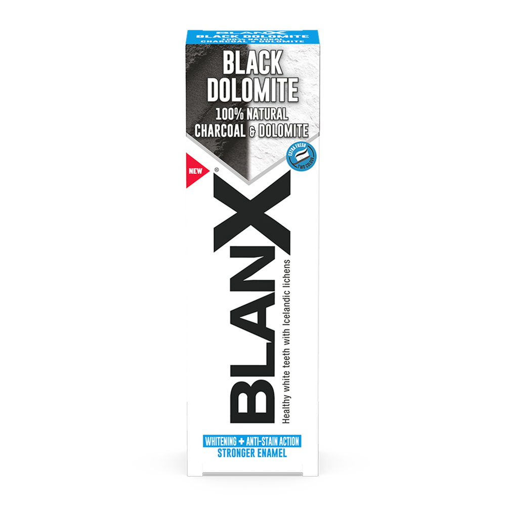 BlanX® Black Dolomite to nowa pasta do zębów BlanX® z dwukolorową formułą, oparta na 100% naturalnych islandzkich porostach, węglu aktywnym i dolomicie, która zapewnia bielsze i mocniejsze szkliwo.