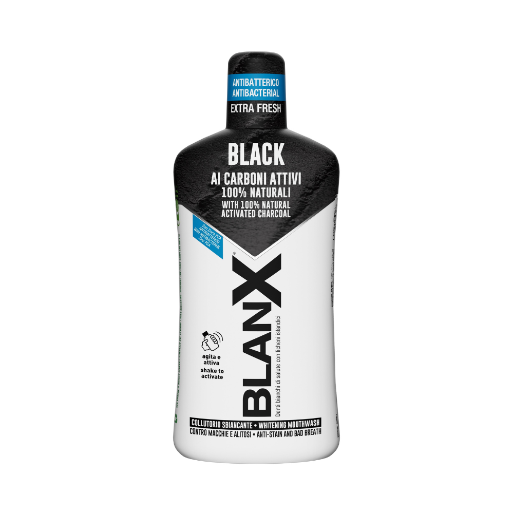 Specjalna formuła płynu do płukania jamy ustnej BlanX® Black łączy działanie antybakteryjne naturalnych porostów islandzkich oraz cynku PCA z wybielającym i przeciwprzebarwieniowym efektem naturalnego węgla aktywnego.