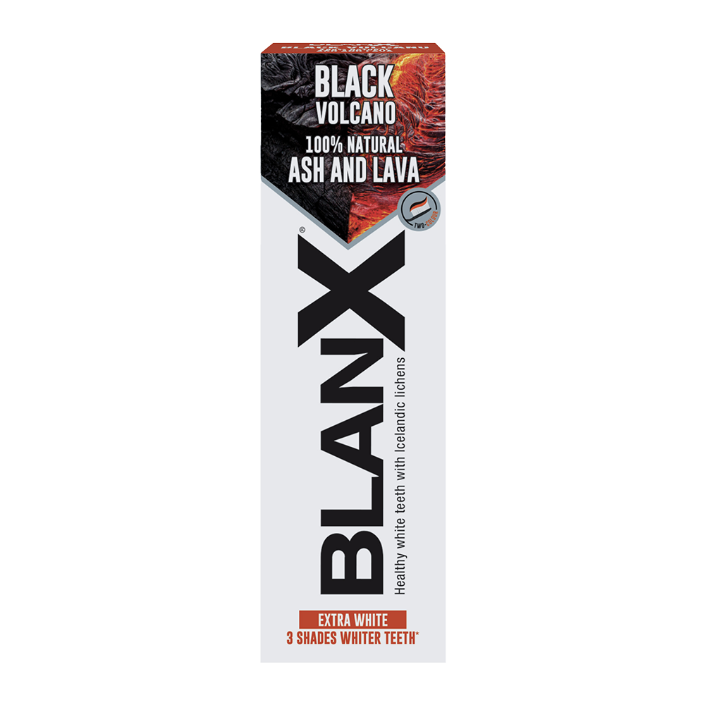 - Dzięki oczyszczającym i absorbującym właściwościom 100% naturalnego popiołu, lawy i węgla aktywnego, BlanX® Black Volcano zapewnia intensywne działanie wybielające.